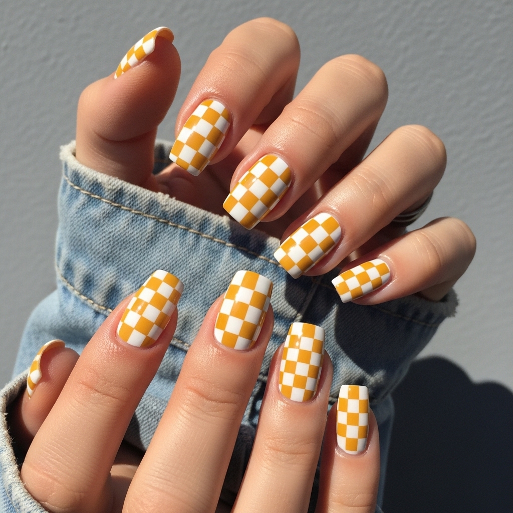 Channel Y2K vibes with a checkerboard pattern in butter yellow and white. This nostalgic design is bold yet wearable for casual or edgy styles.