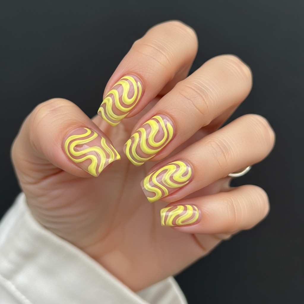 Butter yellow swirls over a sheer nude base bring a fun, artsy touch to your nails. The flowing patterns create movement and visual interest.