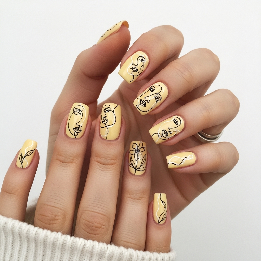 Black or white line art — faces, abstract shapes, or florals — adds a delicate, artsy vibe to butter yellow nails. Ideal for a subtle yet creative look.