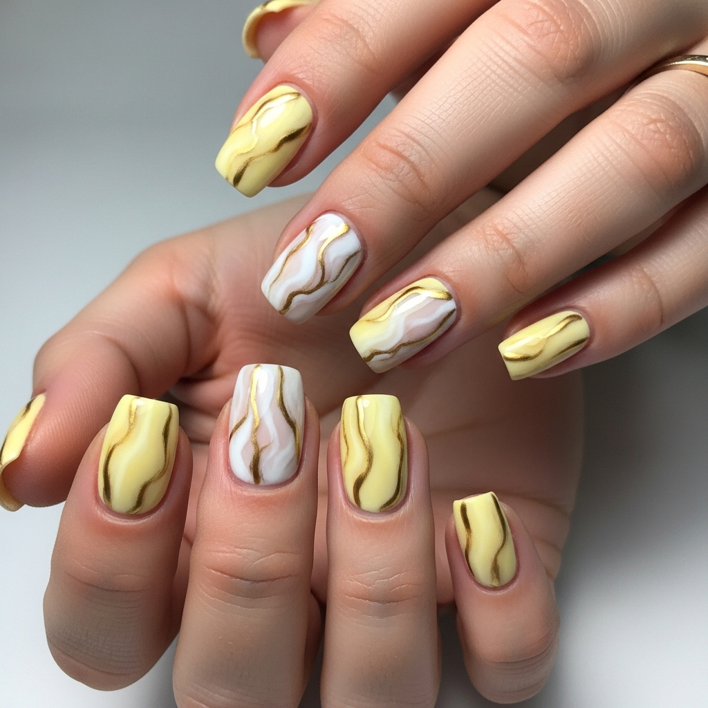 Blend butter yellow with soft white and gold veins for a marble effect. This sophisticated design looks high-end and pairs beautifully with elegant outfits.
