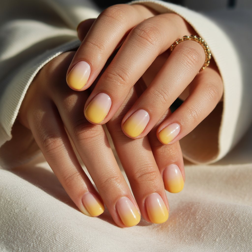 Blend butter yellow with a nude or soft pink base for a subtle gradient. The ombre effect feels romantic and polished, ideal for weddings, date nights, or spring events.