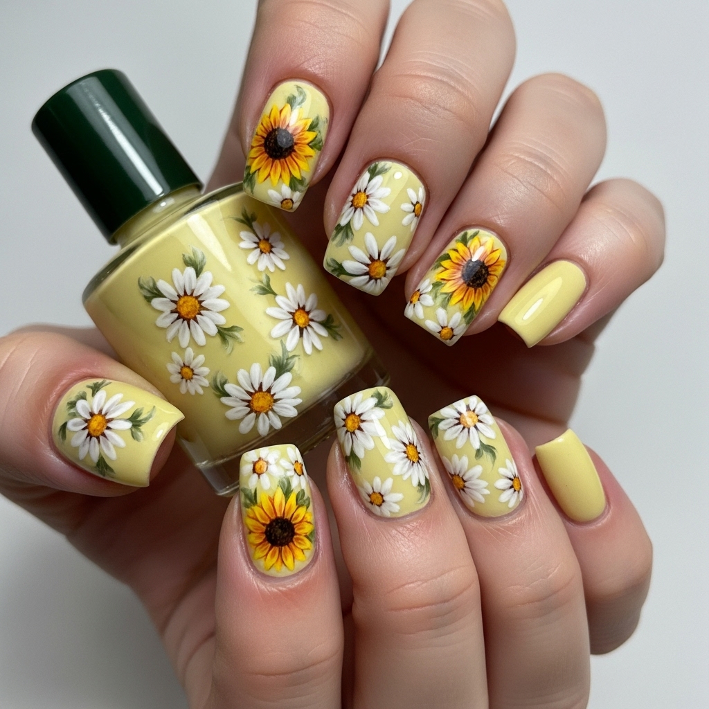 Butter yellow pairs beautifully with delicate floral accents like daisies or sunflowers. Whether hand-painted or using decals, floral nails bring out a soft, springtime charm.