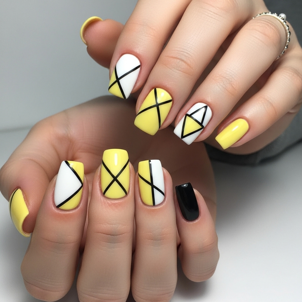 Add a creative edge with geometric nail art — clean lines, triangles, or negative space paired with white or black. Perfect for a minimalist aesthetic with a trendy twist.