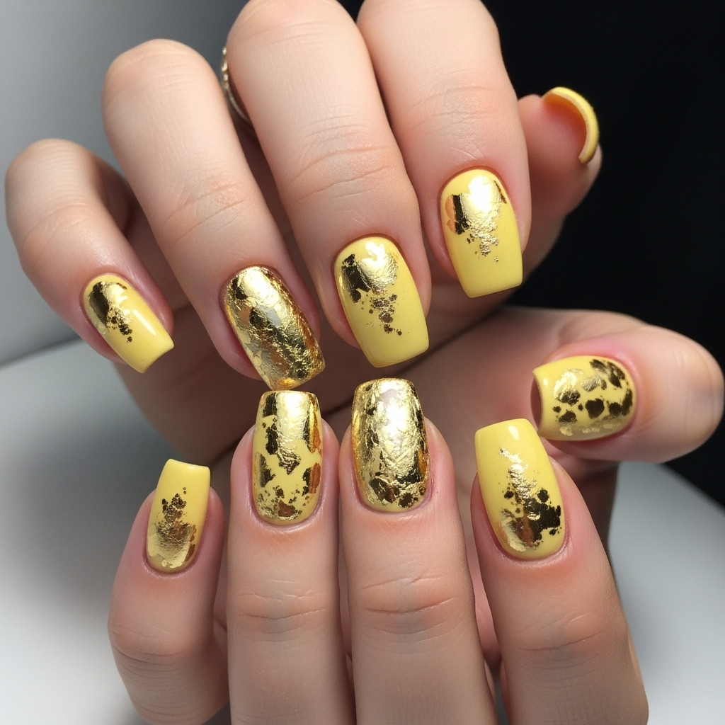 Gold foil detailing over a butter yellow base creates a luxe, eye-catching manicure. Whether for a wedding, party, or a fancy dinner, this design exudes elegance.
