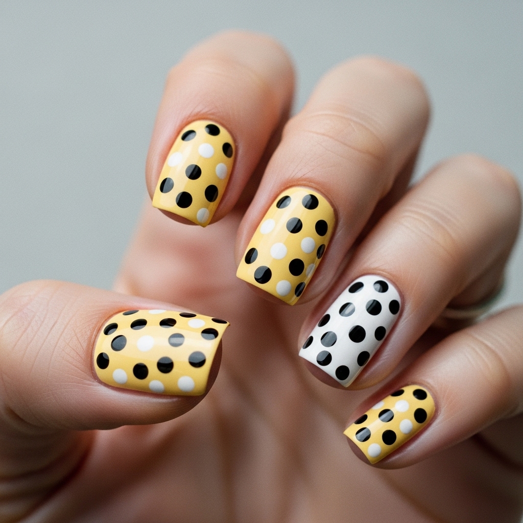 Add retro charm with contrasting polka dots — white, pastel, or black dots over butter yellow make for a quirky yet stylish manicure.