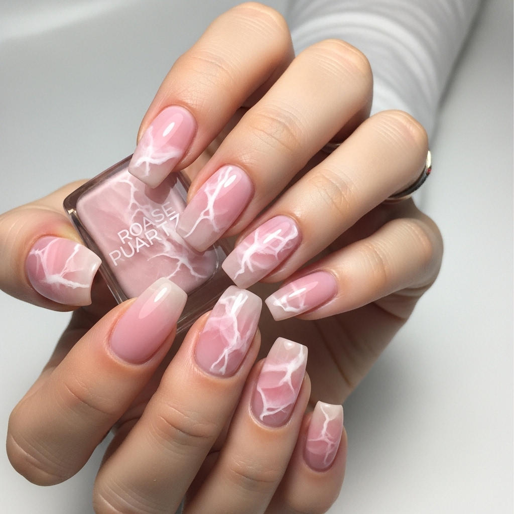 Inspired by the crystal of love, rose quartz nail art blends translucent pink tones with soft white veining, symbolizing romance and serenity — ideal for a spiritual or boho bride.