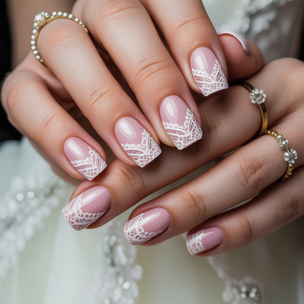 Mimic the elegance of your gown with intricate lace patterns painted over a pink base. This design pairs especially well with vintage or romantic-themed weddings.