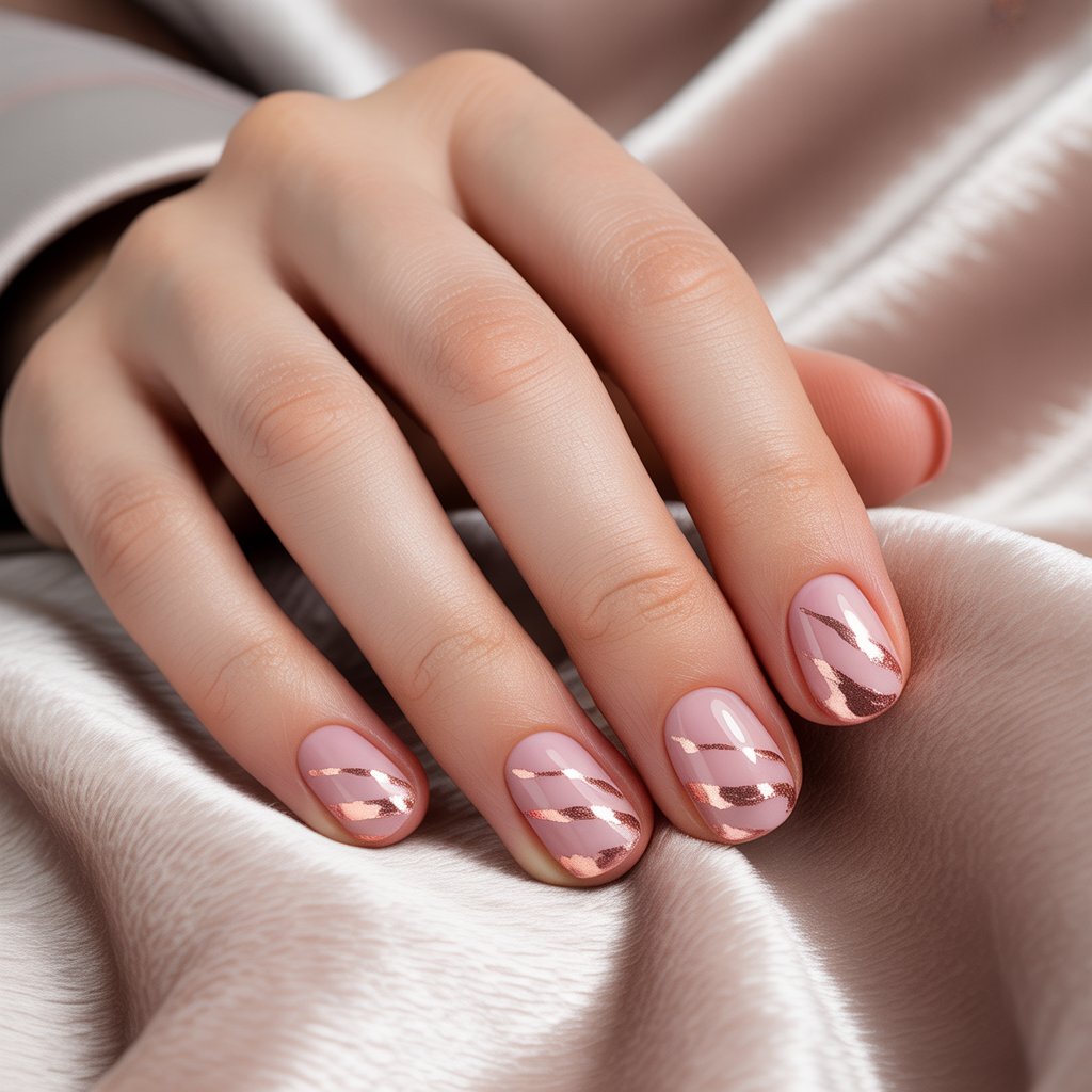 Combine the charm of pink nails with metallic rose gold foil or striping tape. This trendy yet elegant design creates a luxurious finish that matches jewelry and wedding décor effortlessly.
