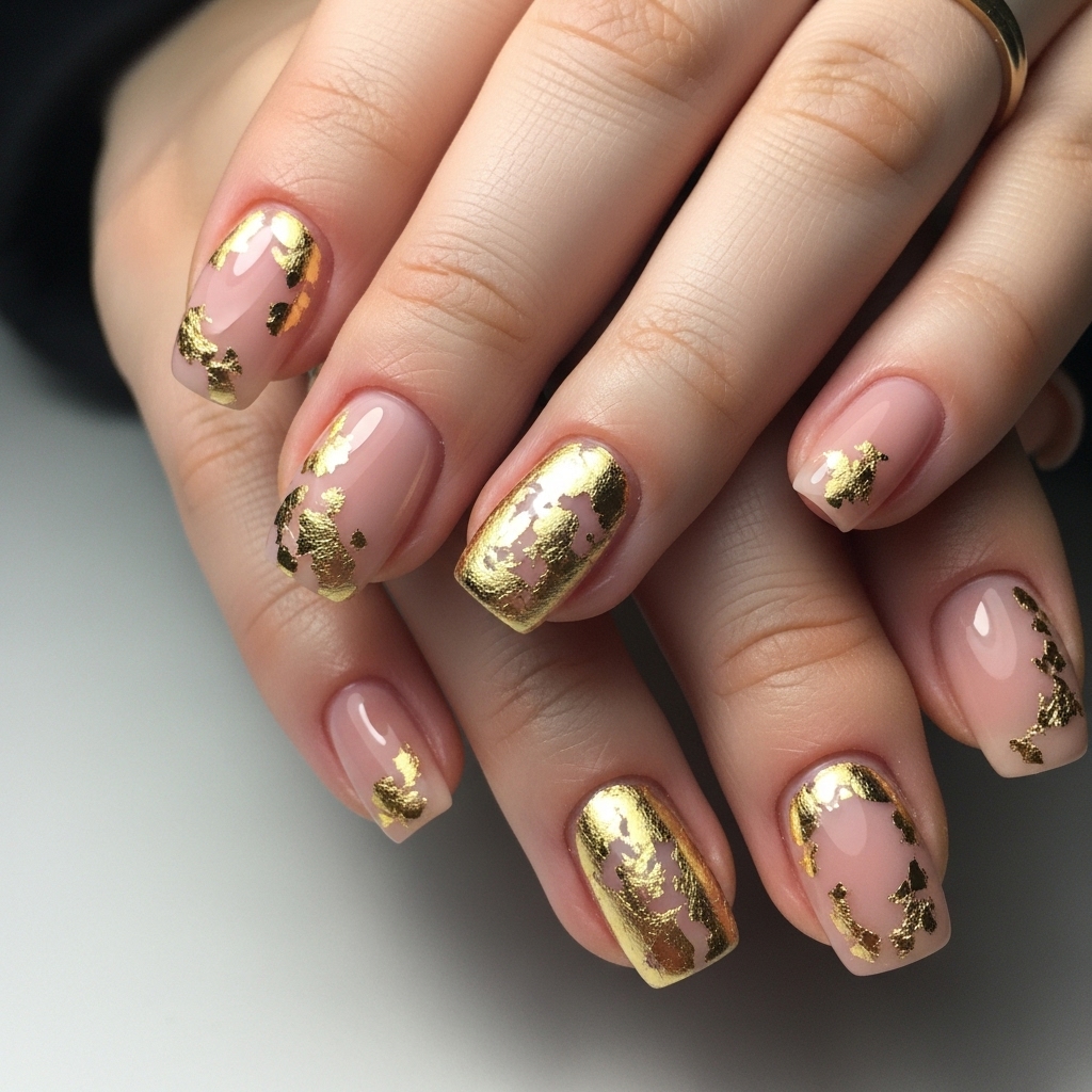 For a chic and upscale manicure, go for a nude-pink base enhanced with gold leaf accents. This combination delivers an opulent vibe that’s both elegant and eye-catching.